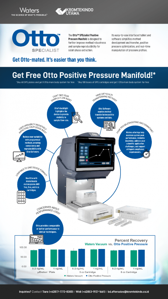 Otto™ SPEcialist Positive Pressure Manifold didesain untuk lebih meningkatkan ketahanan dan reproduktifitas sampel untuk ekstraksi solid-phase. Dapatkan free Otto™ SPEcialist Positive Pressure Manifold untuk setiap pembelian 60 Pcs SPE Plates atau dapatkan free Otto™ SPEcialist Positive Pressure Manifold untuk pembelian 100 box SPE Catridges.